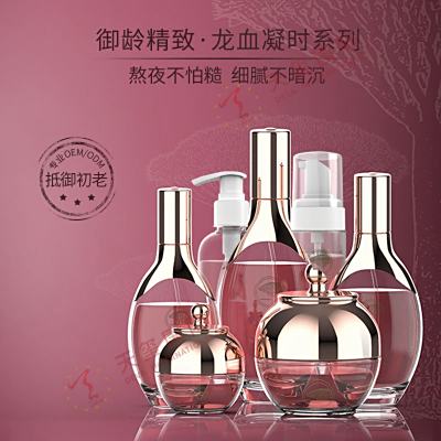 本抚纹紧致套装代加工包含洁肤乳、精华露、紧致晶粉、精华液、多肽修护原液、精华面膜和精华乳霜七款产品,加入紧致修护成分六肽-9+乙酰基六肽-8+胶原蛋白净透亮肤,塑颜紧致