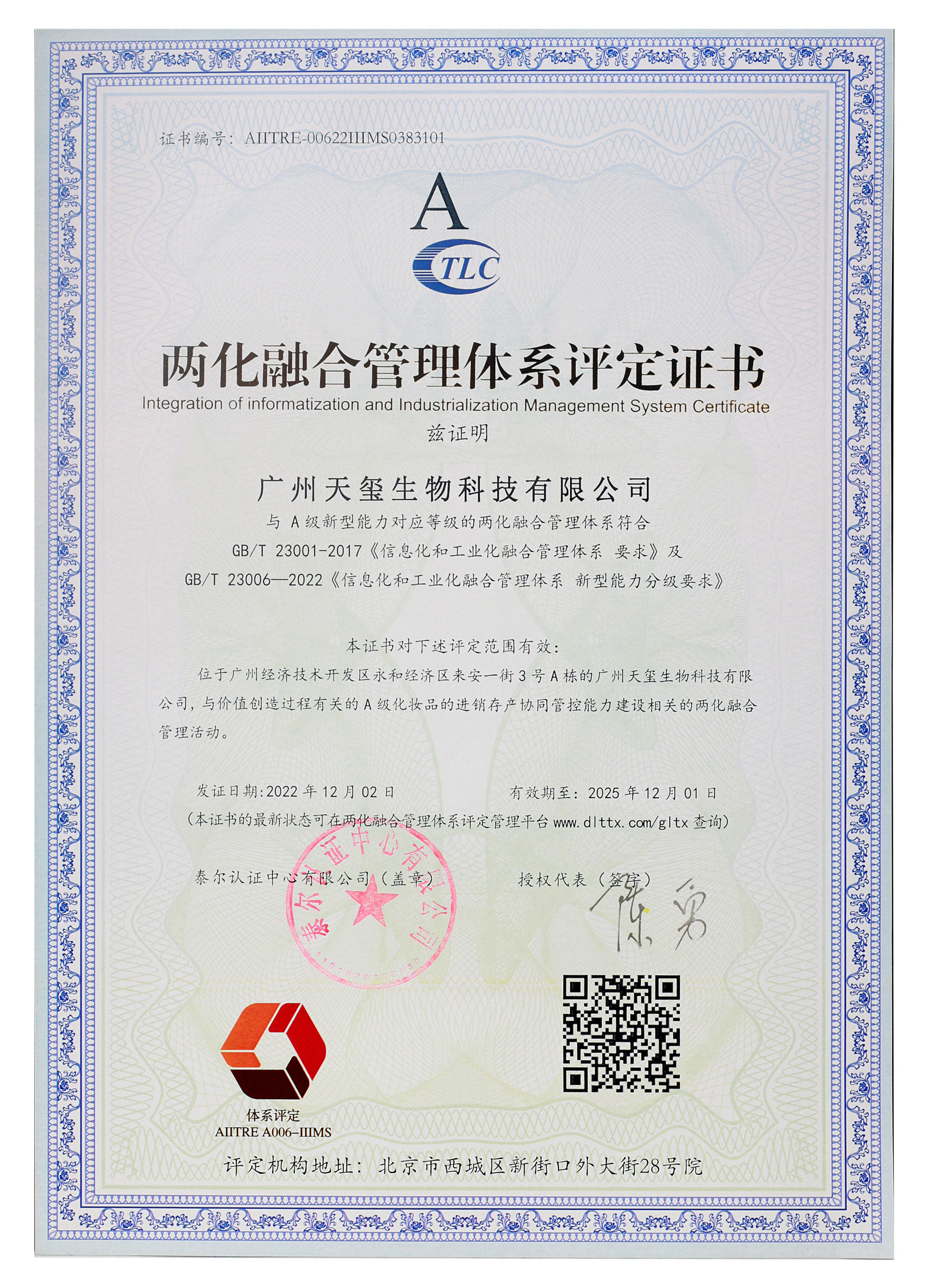 此次天玺生物科技有限公司(以下简称“天玺国际”)荣获“两化融合管理体系评定证书”,标志着我司信息化与工业化、数字化深度融合获得权威认可,这为天玺国际进一步推进科技创新、智能研发、工厂品牌化打下了坚实的基础。