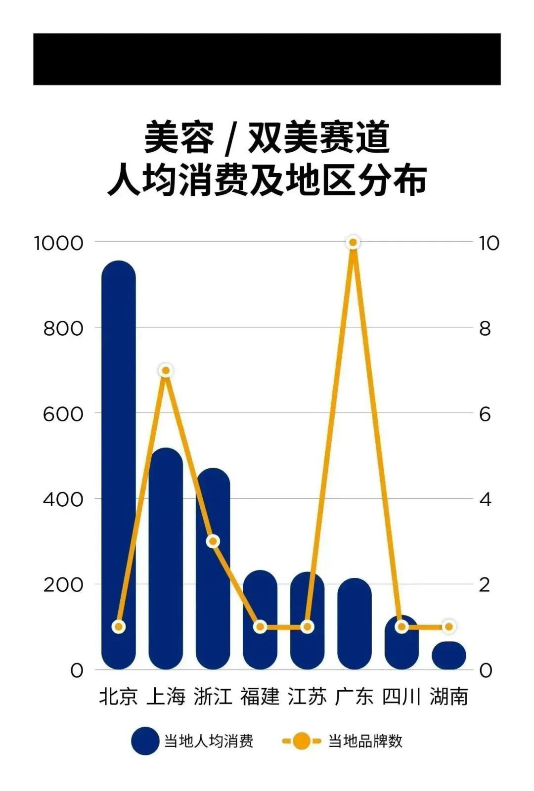 轻医美通过非手术的方式实现美容效果,备受追求自然、安全、低风险的新时代消费者喜爱。为满足消费者更加细节化、个性化、专业化的需求,本次评选中的众多双美企业都推出了针对不同功能和部位的多个团购项目,例如根据功能分类的美白、淡斑、清洁、补水、紧致等,以及根据部位分类的肩颈舒缓、足部护理、背部艾灸、面部拔筋等平台套餐。数据方面,本次评选中轻医美的品牌数量占据29%,包括美容/双美赛道品牌与个人美容仪器品牌。在美容/双美赛道中,总部位于广东的品牌最多,共有10个,占本赛道总企业38%,然而,广东人均消费仅为213.6元,低于中位数230元,而北京和上海的人均消费最高,均超过500元。
