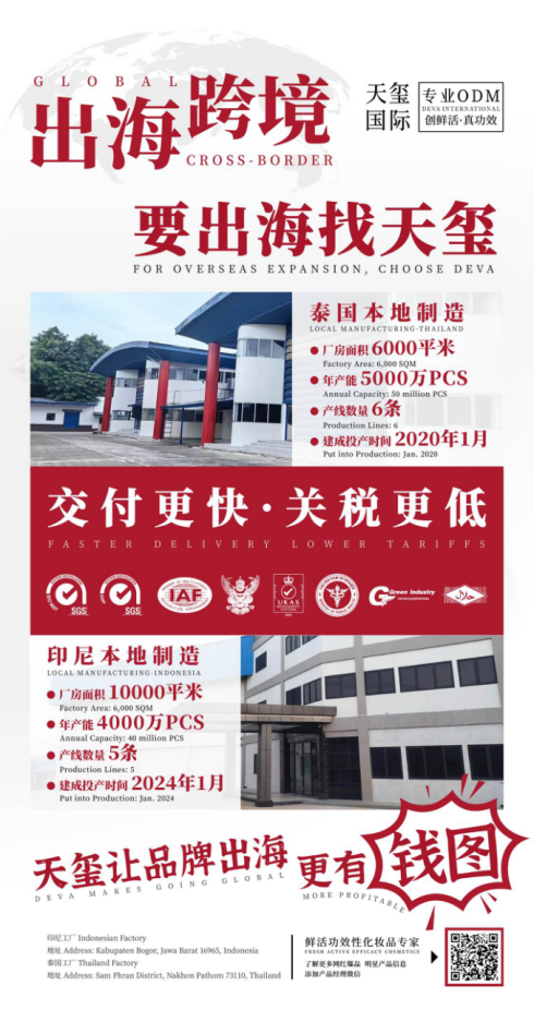 作为全球智造的领导者,天玺国际提供了一条龙式的出海解决方案。公司拥有专业的研发团队、4000多款成熟配方、严格的8S质量管理标准,以及72道测试与工艺检测流程,确保每一款产品都能满足国际标准。天玺国际不仅在广州拥有三座现代化化妆品制造工厂,还在泰国和印尼持股战略合作工厂,帮助品牌方实现海外本地化制造和快速交付。