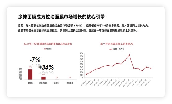 后疫情时代,伴随着宅家美容趋势,涂抹面膜增长显著,增速远超面膜品类整体和美容护肤大类。涂抹面膜的线上成交增长,有47%来自面部护理市场中其他品类人群,贴片面膜、精华和面霜等品类用户的流入,为涂抹面膜赛道带来可观增长。