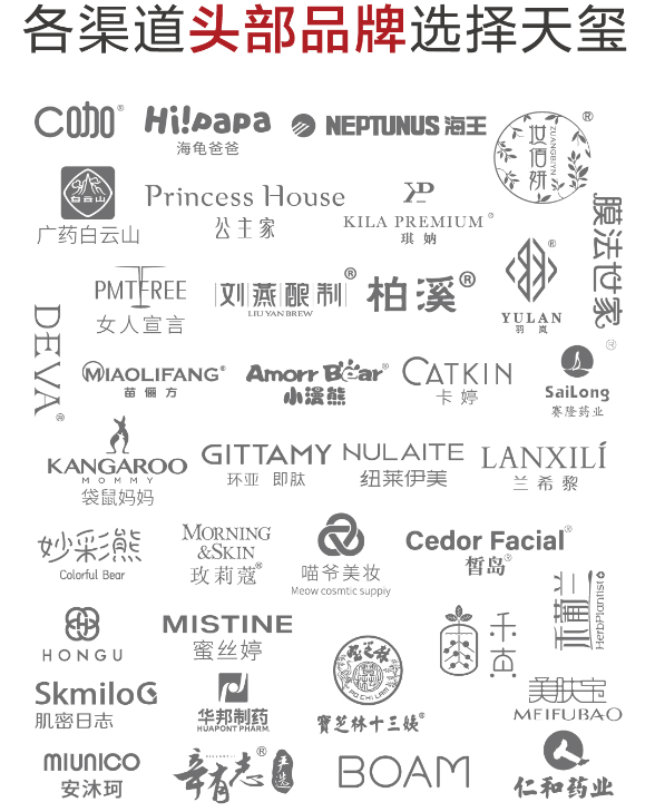 天玺国际以优异的产品和优质的服务,系统化解决方案,博得了客户的一致好评,并引起美妆行业和市场头部、新锐品牌,以及跨界企业的广泛关注,其中不乏多个亿级以上高质量客户成为天玺的主力客群。例如:头部新锐品牌中的C咖、大曾、阿奴、皙岛、安沐珂、森博士等品牌;跨界企业中的红谷印象、华邦制药、赛隆药业、仁和药业等已与天玺建立稳定的合作关系。今年新增近50家不同领域的品牌商选择信任我们,这个数字仍不停递增。