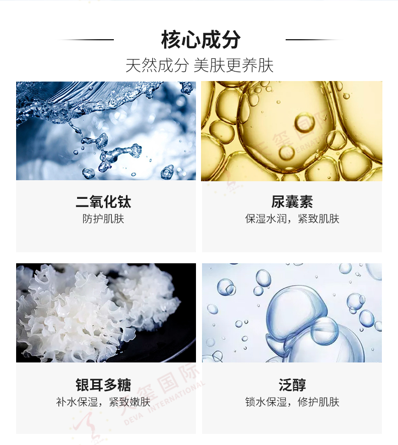 核心成分:1、防晒成分:二氧化钛 2、保湿成分:尿囊素 3、抗氧化成分:银耳多糖 4、保湿修护成分:泛醇
