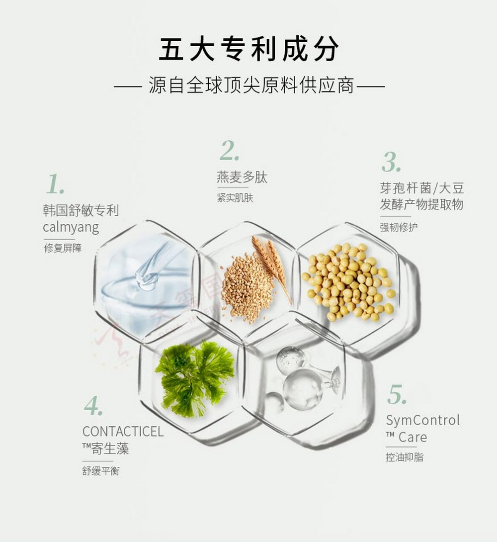 核心成分:1、舒缓专利成分:Calmyang 2、燕麦多肽:紧实肌肤 3、芽孢杆菌/大豆发酵产物提取物:强韧修护