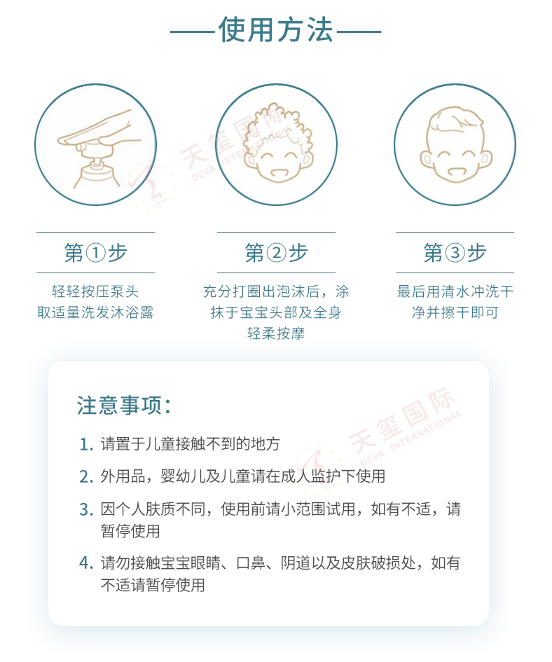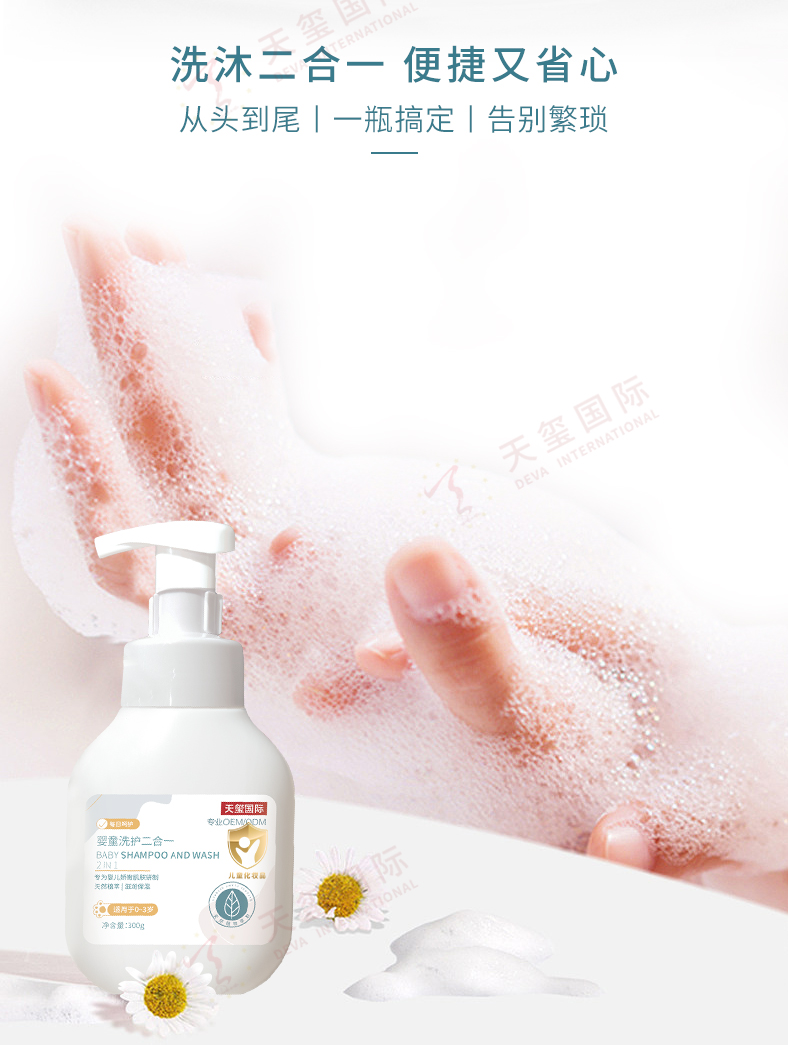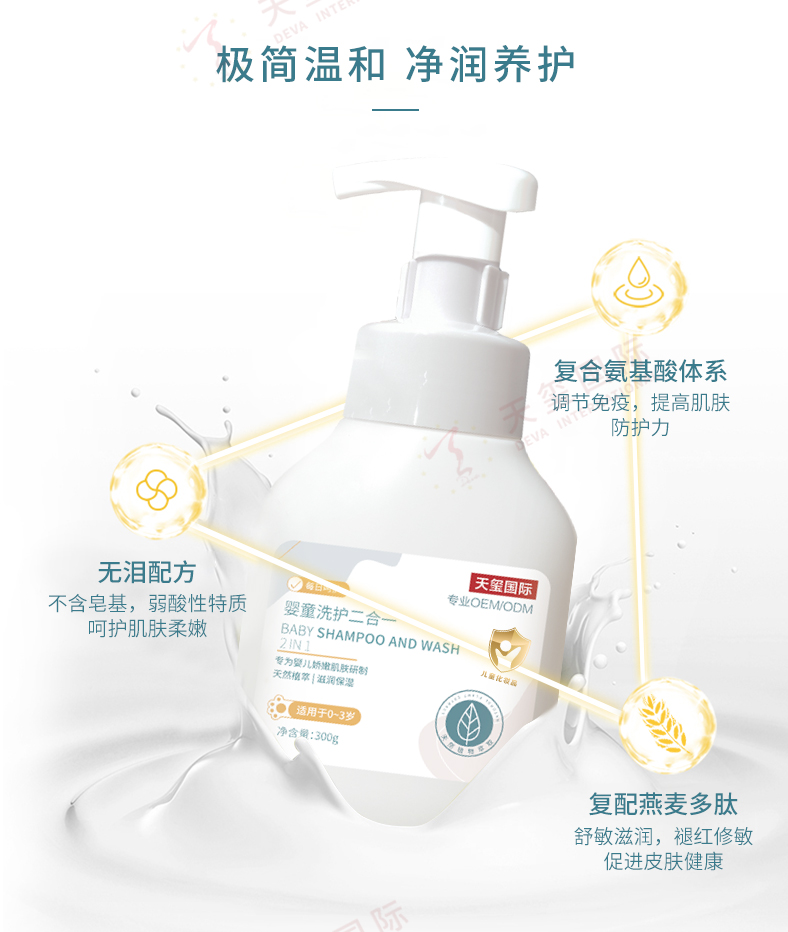 亮点/卖点:本婴童洗沐二合一产品经过严格测试,选用无泪安全配方,极简温和,呵护宝宝娇嫩肌,洗澡/洗头,从头到尾一瓶搞定
