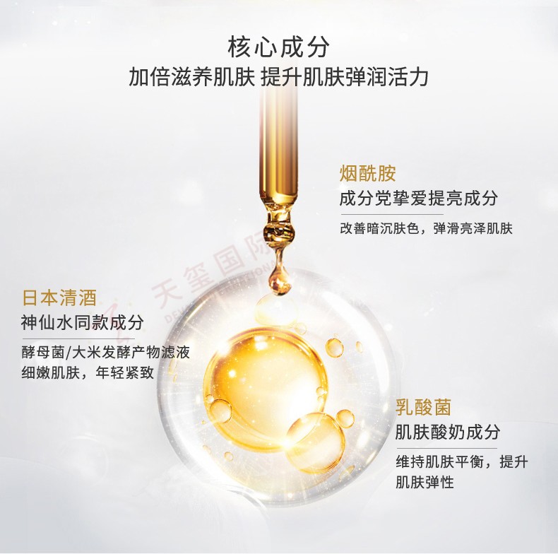 亮点/卖点:本精华液代加工加入神仙水同款成分——日本清酒,复配烟酰胺及乳酸菌,能有效滋润肌肤,提升肌肤弹润活力,一滴润泽,赋活逆光透亮肌