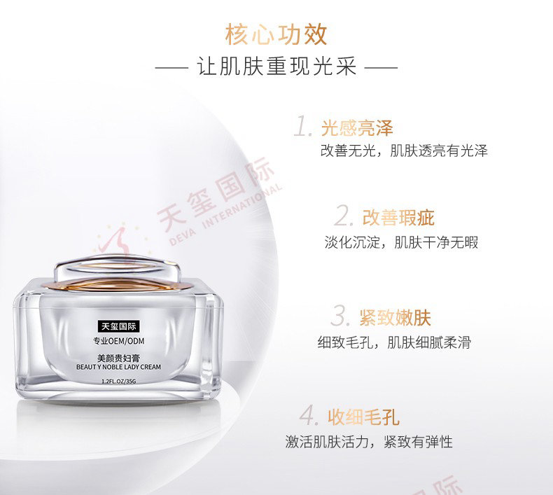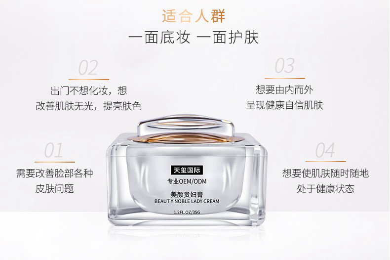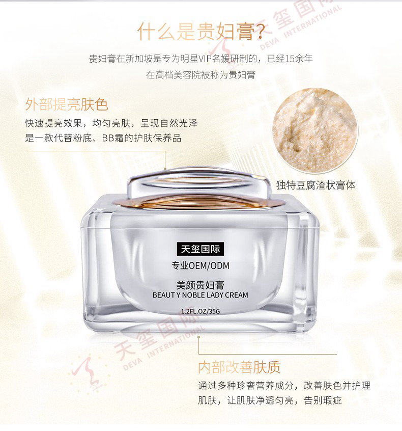 亮点/卖点:本贵妇膏代加工专为暗沉、黄皮肌肤女性研发,添加5%珍珠粉,改善粗糙发黄、暗沉脆弱等多种肌肤问题,亮肤更养肤