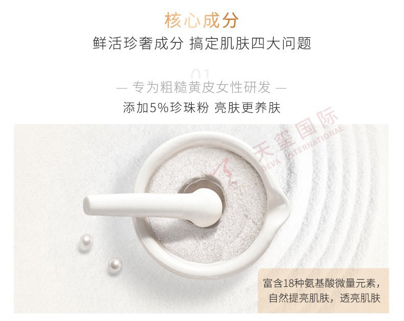 核心成分:1、经典美颜养肤成分:珍珠粉 2、明星提亮成分:烟酰胺 3、多种珍奢植萃提取物温和养护