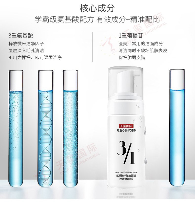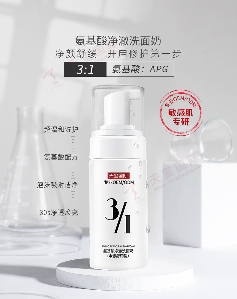 亮点/卖点:本氨基酸洗面奶贴牌加工采用3:1的氨基酸/APG配比,专为敏感肌定制,净颜舒缓,1秒钟起泡,1分钟温和洁净毛孔,洗护合一