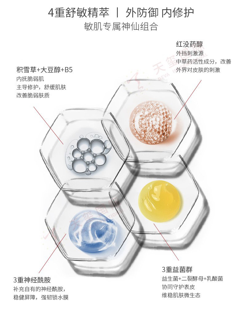 核心成分:1、更温和的界面成分,3:1氨基酸+葡糖苷;2、维稳成分:3重益菌群;3、屏障修护成分:多重神经酰胺;4、修护成分:积雪草+红没药醇
