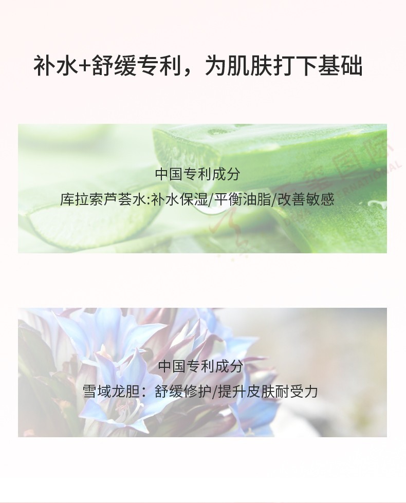 核心成分:1、千叶玫瑰:焕亮肤色,保湿、防止肌肤水分流失 2、小球藻油:舒缓肌肤,增强防御力,促进胶原生成,改善肌肤纹理 3、库拉索芦荟水:补水保湿,平衡油脂,改善敏感 4、雪域龙胆:舒敏修护,提升皮肤耐受力