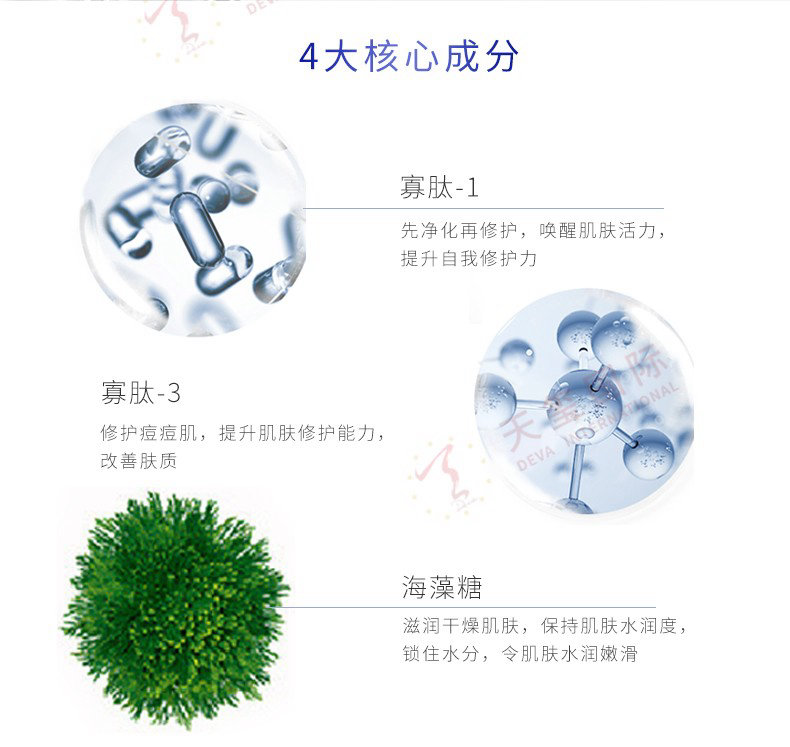 核心成分:1、净痘舒纹成分:寡肽-1;2、修护成分:寡肽-3;3、天然保湿成分:海藻糖