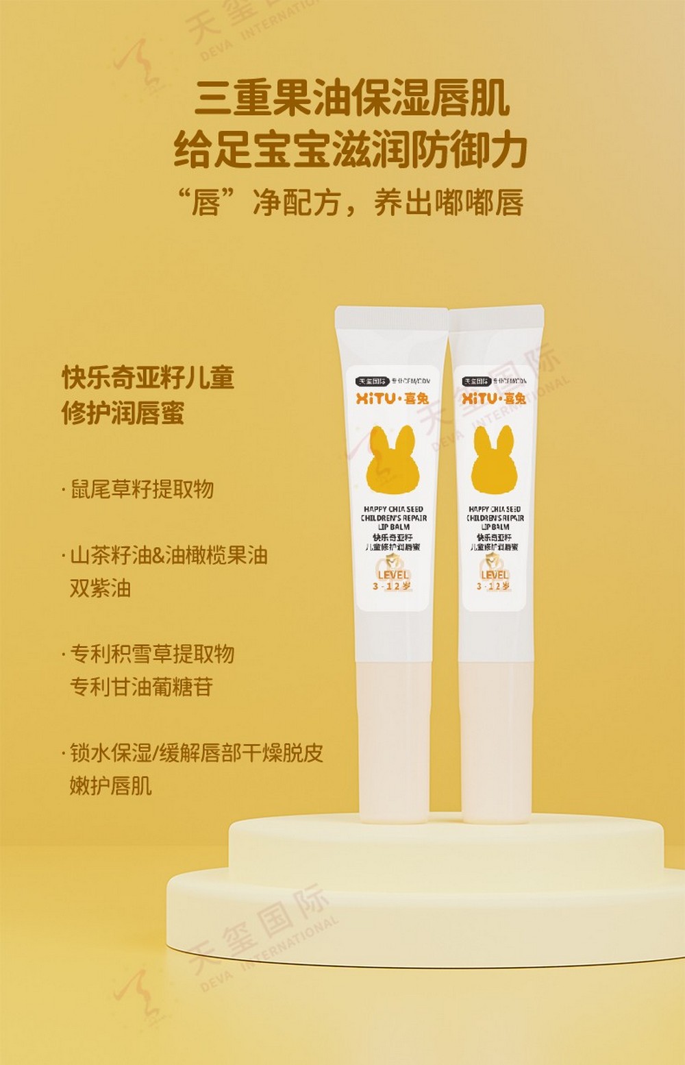 快乐奇亚籽儿童修护润唇蜜:鼠尾草籽提取物,山茶籽油&油橄榄果油,双紫油,专利积雪草提取物,专利甘油葡糖苷,锁水保湿/缓解唇部干燥脱皮嫩护唇肌