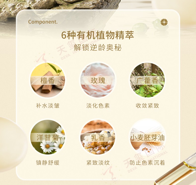 核心成分:1、檀香:补水淡皱 2、玫瑰:淡化色素 3、广藿香:收敛紧致 4、洋甘菊:舒缓放松 5、乳香:紧致淡稳 6、小麦胚芽油:防止色素沉着