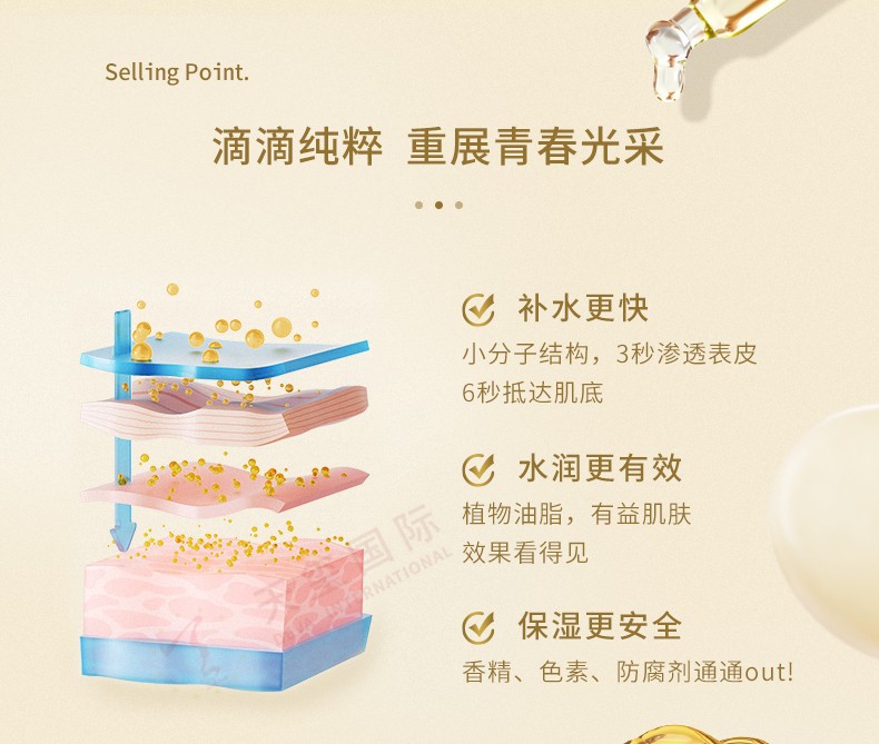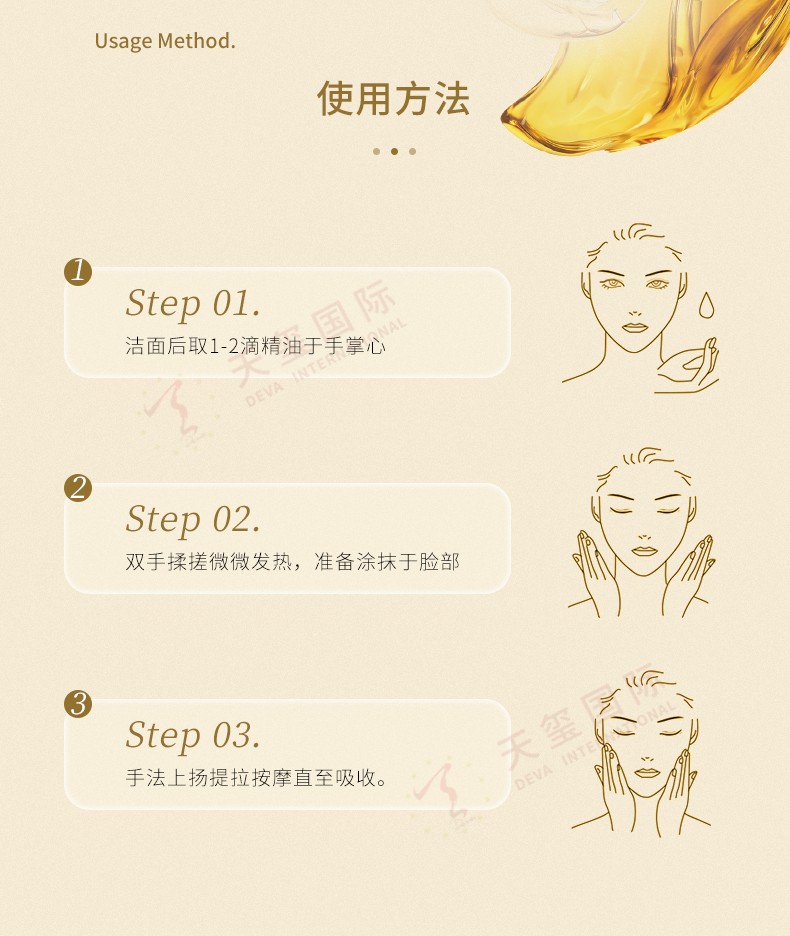 亮点/卖点:本爆款面部精油OEM/ODM以檀香、玫瑰提取物等6种有机植物精萃为核心成分,解锁肌肤逆龄的奥秘,滴滴纯粹,补水更快,保湿更安全,有效改善粗糙,守护娇嫩肌