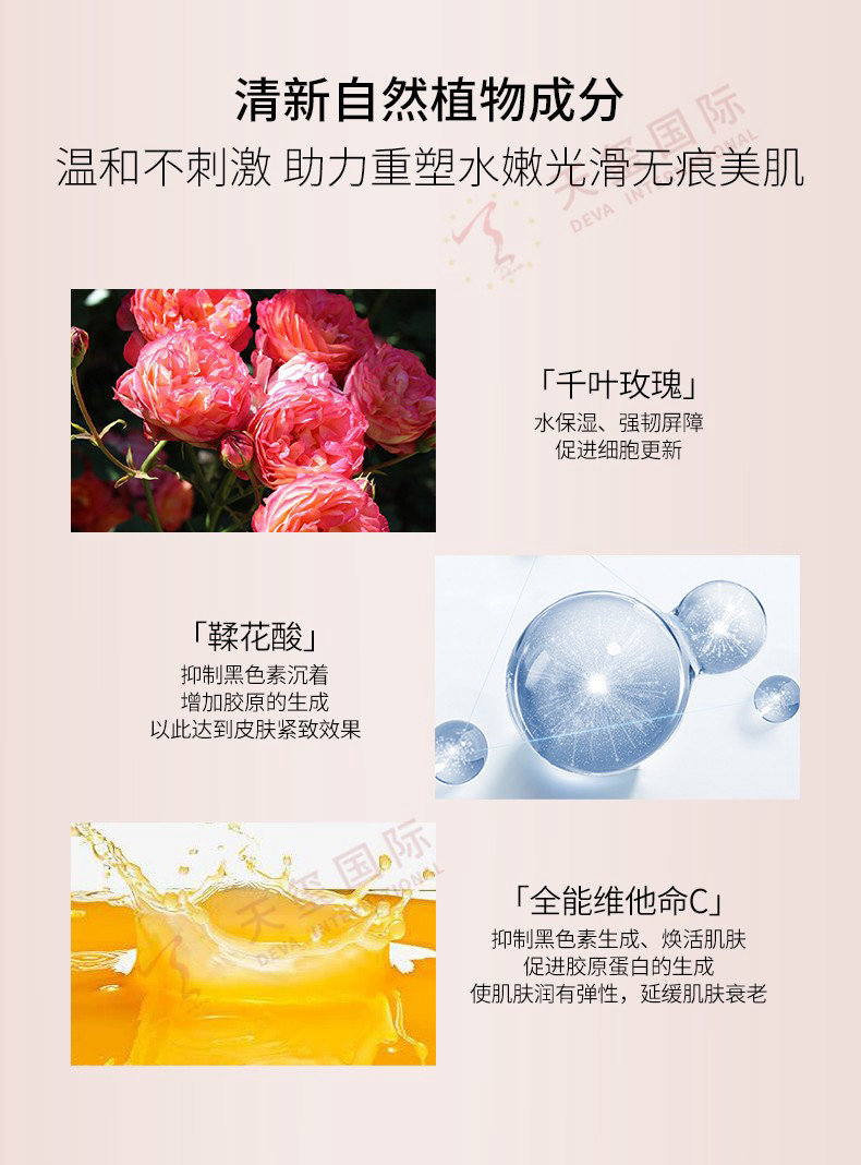 核心成分:1、千叶玫瑰:强韧屏障,促进细胞更新;2、鞣花酸:抑制黑色素沉着;3、全能维他命C:促进胶原蛋白合成