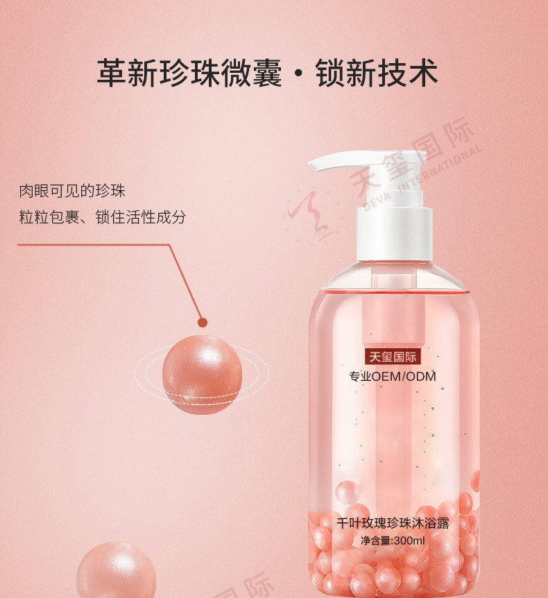 亮点/卖点:本爆品珍珠沐浴露贴牌采用革新的珍珠微囊,牢牢锁住活性成分,让营养伴随沐浴露滋润全身肌肤,温和不刺激,芳香透肤,如沐玫瑰丛