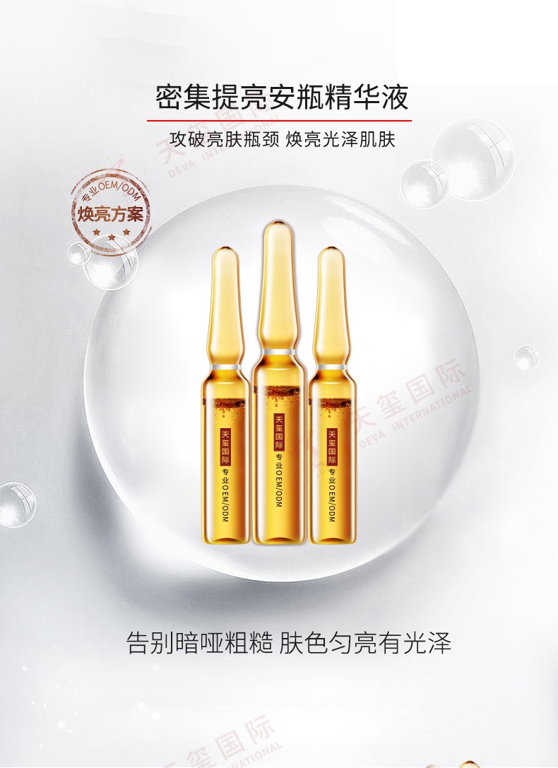 该产品为提亮安瓶精华液代加工产品,并非现货可批发或单独购买!同时也有其他安瓶类产品代加工及全类型护肤品OEM/ODM,产品品类及功效众多无法一一展示,如需了解更多护肤品代加工可直接联系我司客服人员,感谢您的信赖与选择!