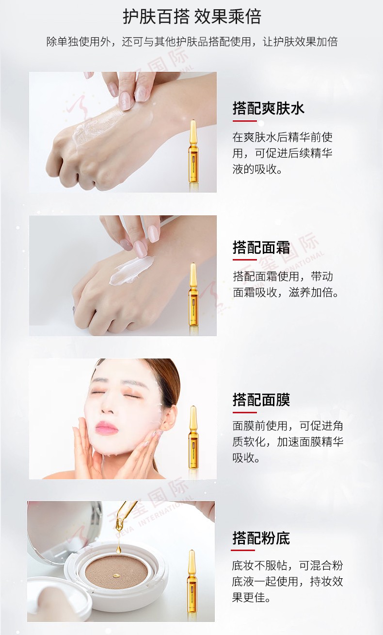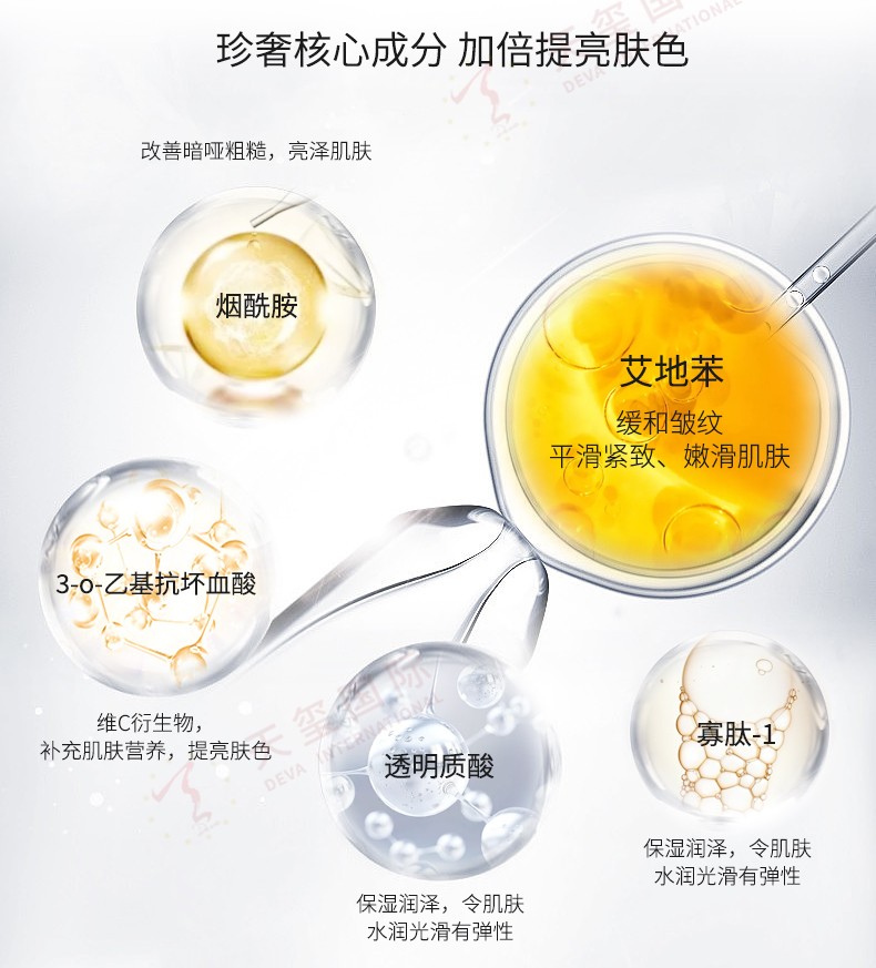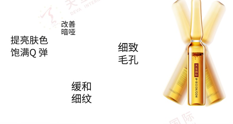 亮点/卖点:本提亮安瓶代加工加入烟酰胺、艾地苯、透明质酸和寡肽-1等多种珍奢成分,改善皮肤暗哑粗糙,亮泽肌肤