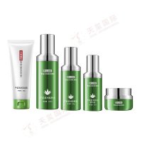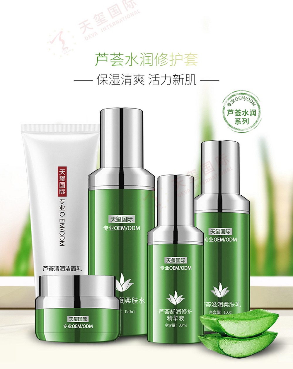 亮点/卖点:本芦荟水润修护套装代加工包含清润洁面乳、滋润柔肤水、修护精华液、滋润柔肤乳和滋润修护霜五款产品,精选库拉索芦荟令肌肤保湿润泽、控油平衡,缓解肌肤干燥