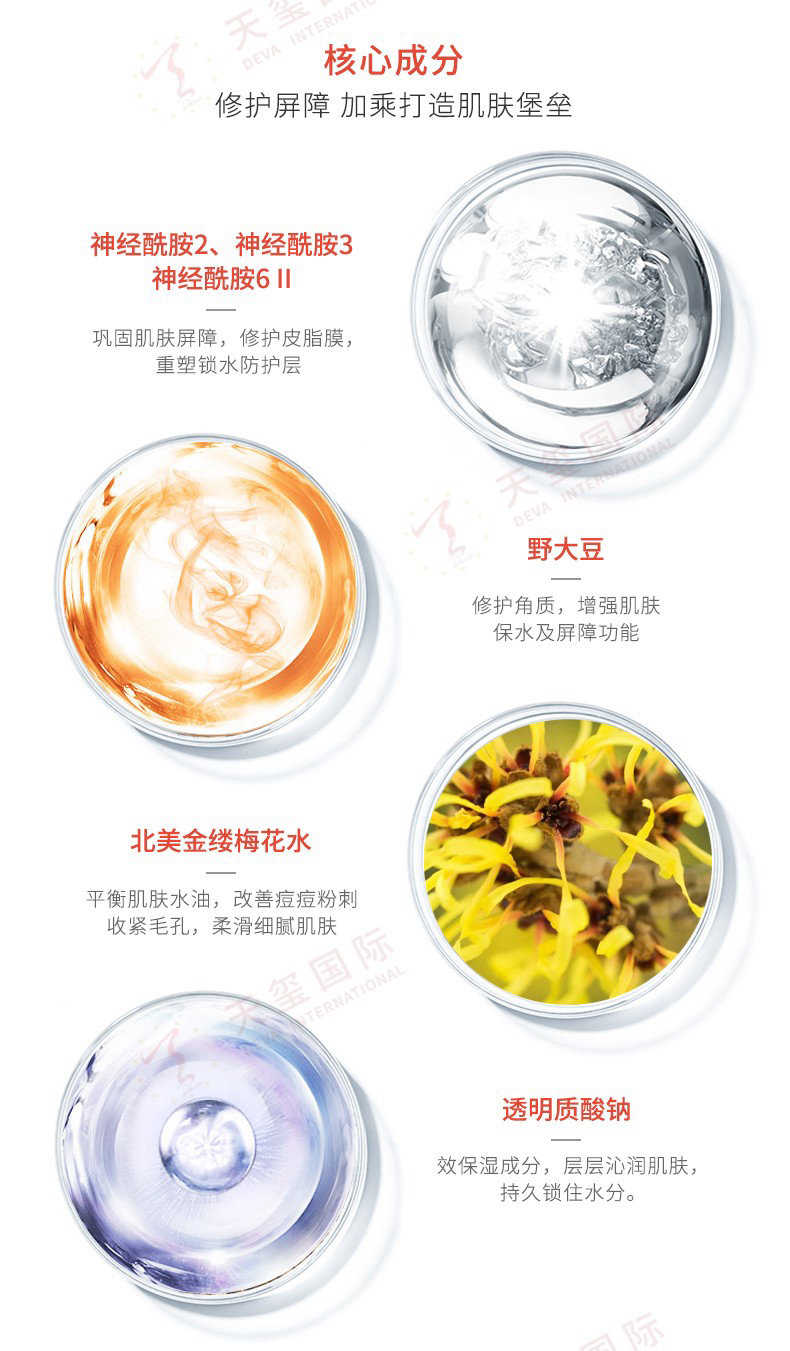 核心成分:1、屏障修护成分:多重神经酰胺 2、收敛调理成分:金缕梅 3、修护角质成分:野大豆 4、热门明星补水成分:透明质酸钠