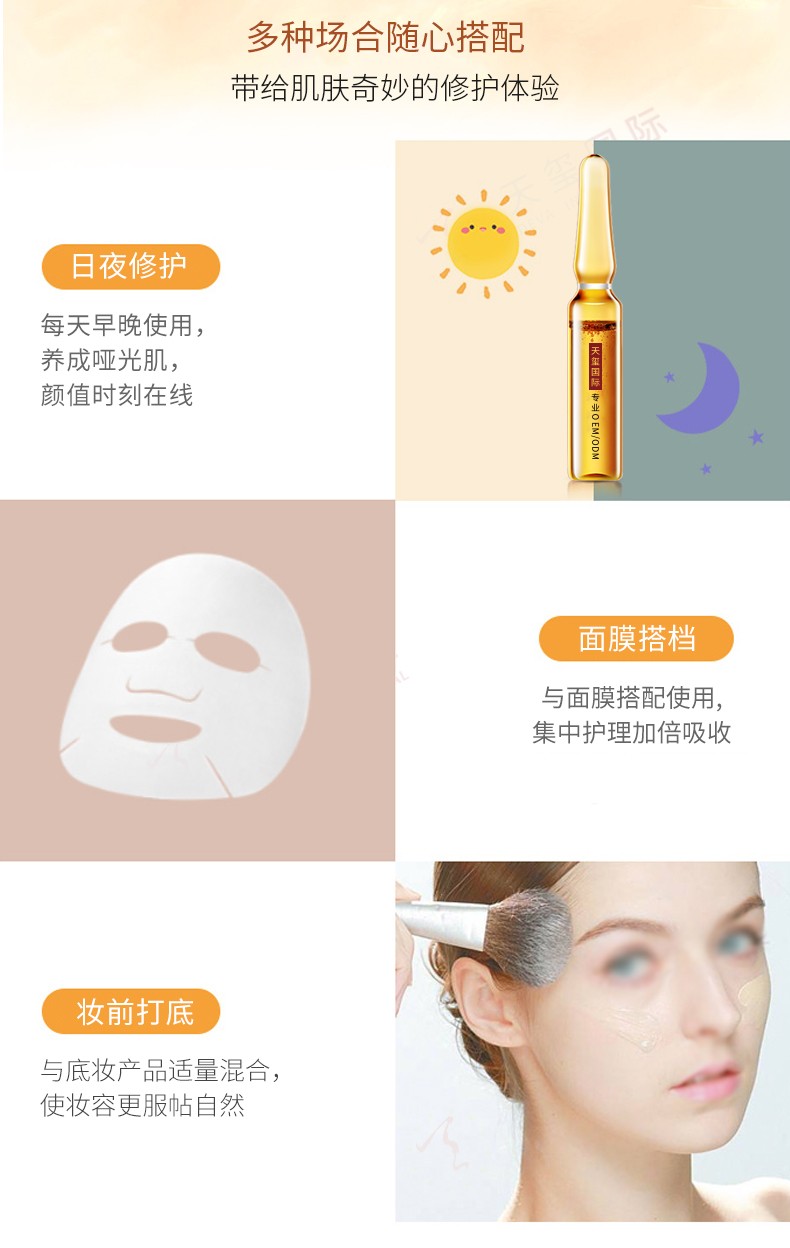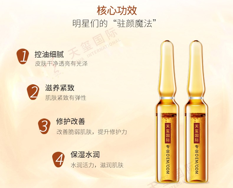 该产品为热推安瓶代加工产品,并非现货可批发或单独购买!同时也有其他安瓶类产品代加工及全类型化妆品OEM/ODM,产品品类及功效众多无法一一展示,如需了解更多护肤品代加工可直接联系我司客服人员,感谢您的信赖与选择!