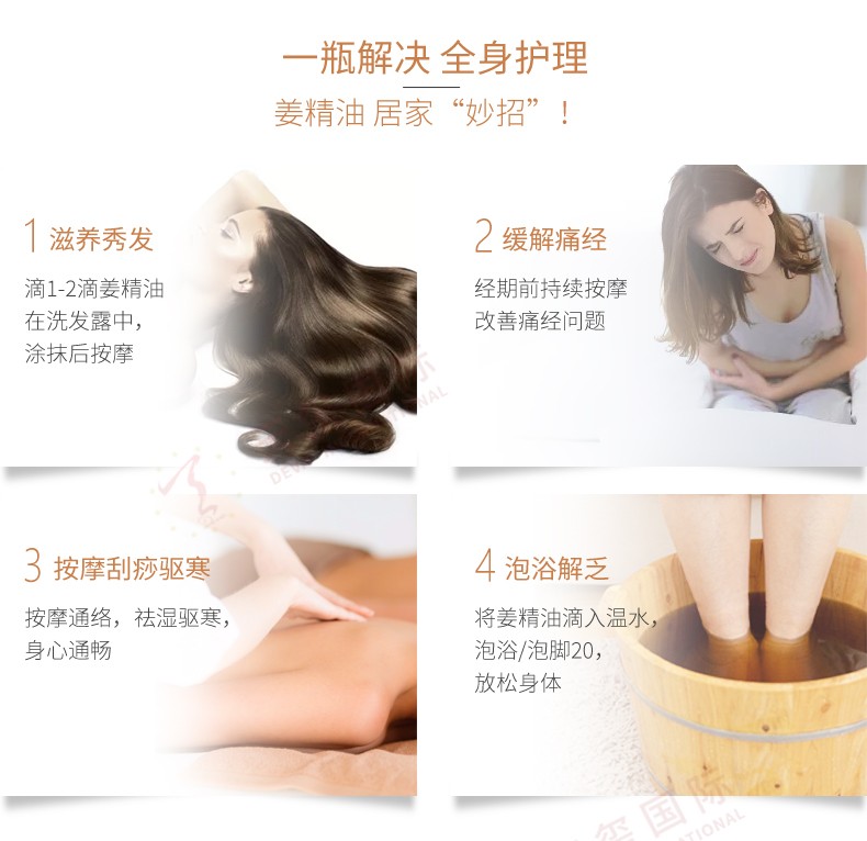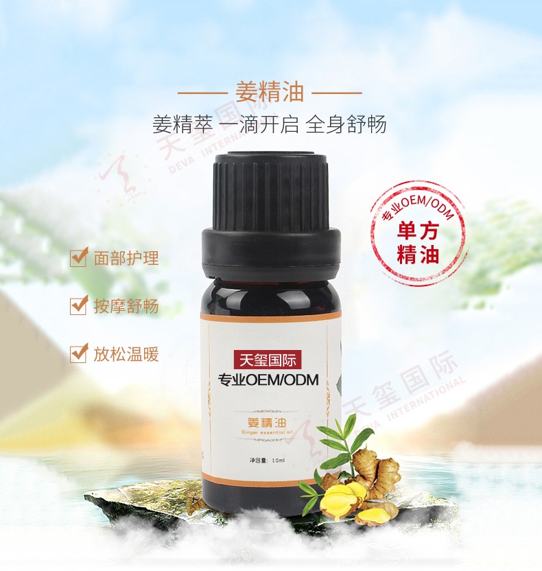亮点/卖点:本姜根油精油OEM运用蒸馏法萃取得到,姜根油能促进循环,消散淤血、祛湿驱寒,调理体寒问题