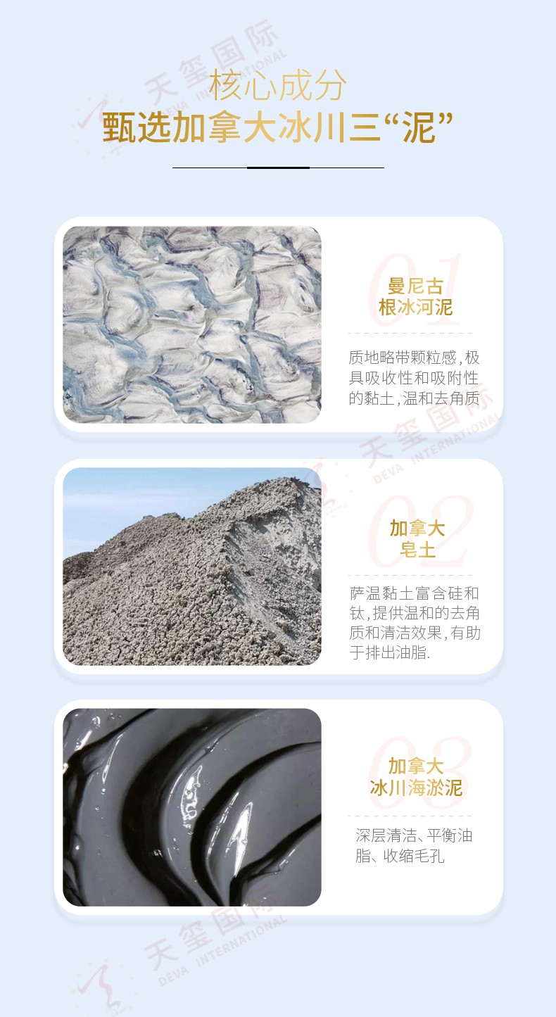核心成分:曼尼古根冰河泥,质地略带颗粒感,极具吸收性和吸附性的黏土,温和去角质;加拿大皂土,萨温黏土富含硅和钛,提供温和的去角质和清洁效果,有助于排出油脂;加拿大冰川海淤泥,深层清洁、平衡油脂、收缩毛孔;99.8%高浓度烟酰胺,美白提亮肤色、加速新陈代谢;桦褐孔菌提取物,延缓御龄、抵御紫外线;牛油果树果脂,防氧,御龄;积雪草提取物,紧致肌肤效果,增加皮肤的保水度;马齿苋提取物修护肌肤屏障;库拉索芦荟水,平衡肌肤水油、锁水保湿