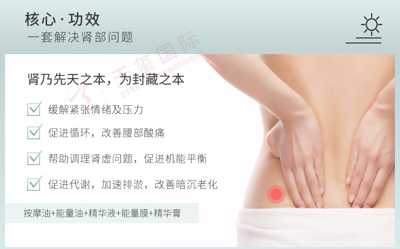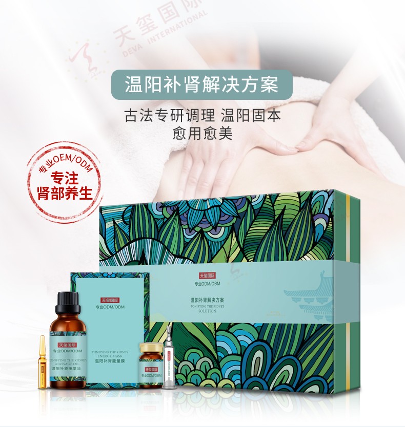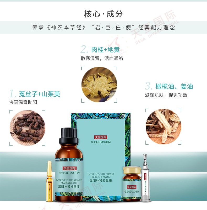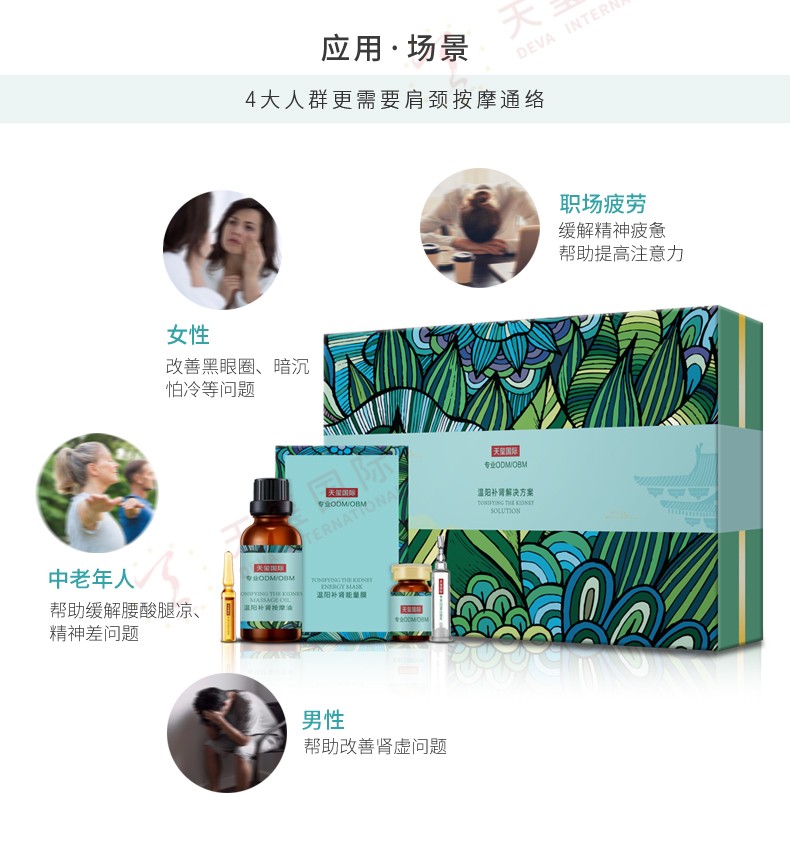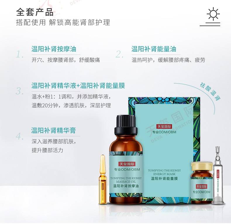 亮点/卖点:本温阳补肾解决方案代加工产品包含按摩油、能量油、精华液、能量膜以及精华膏五款产品,能有效缓解紧张情绪及压力,促进循环,调理肾部问题,是专业线爆单推荐套盒