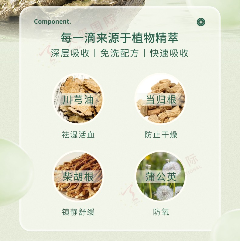 核心成分:1、川芎油:祛湿活血 2、当归根:防止干燥 3、蒲公英:防氧
