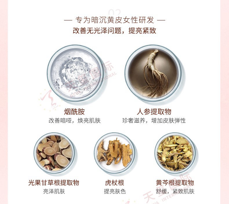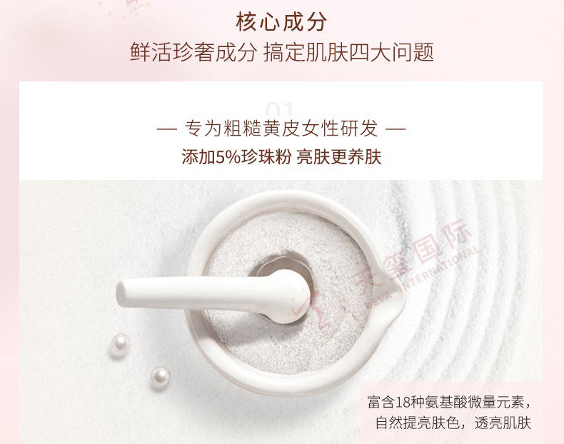 核心成分:1、经典美颜养肤成分:珍珠粉;2、火爆提亮成分:烟酰胺;3、多种珍奢植萃提取物温和养护