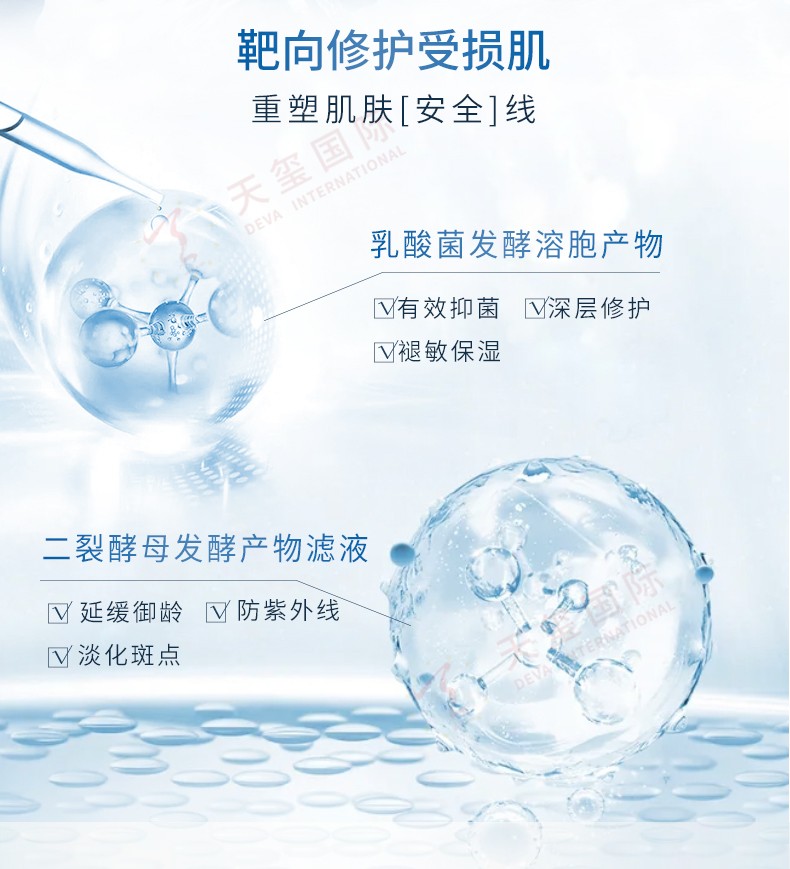 亮点/卖点:本修护安瓶贴牌加工添加乳酸菌发酵溶胞产物和二裂酵母发酵产物滤液核心成分,靶向修复受损肌,重塑肌肤安全线,有效抑菌,深层修护