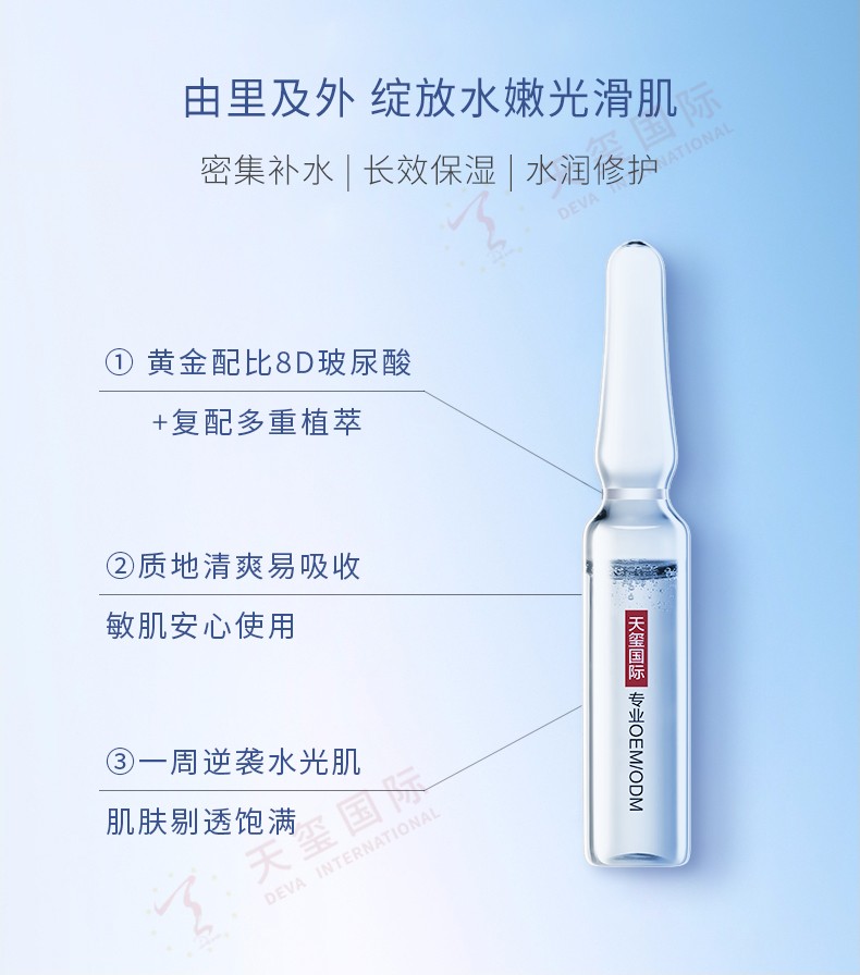 亮点/卖点:本补水安瓶贴牌加工黄金配比8D玻尿酸+多重植物精粹,质地清爽易吸收,由里及外,绽放水光嫩滑肌,敏肌安心使用