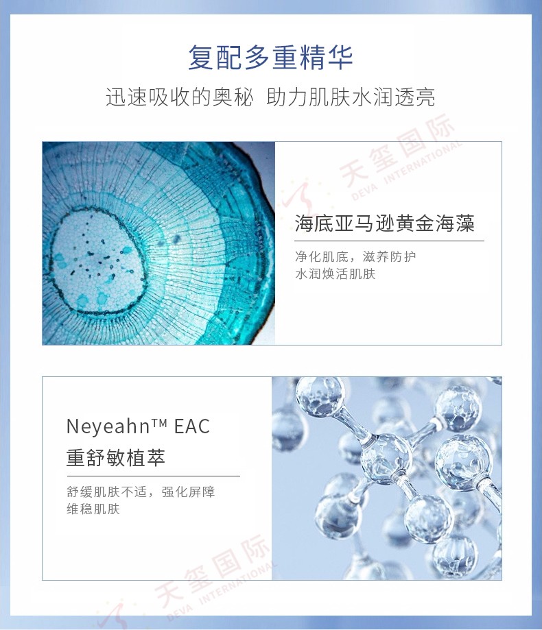核心成分:1、巨补水成分:8D玻尿酸 2、舒缓维稳成分:NeyeahnTMEAC重舒敏植萃 3、滋养防护成分:亚马逊海底黄金海藻