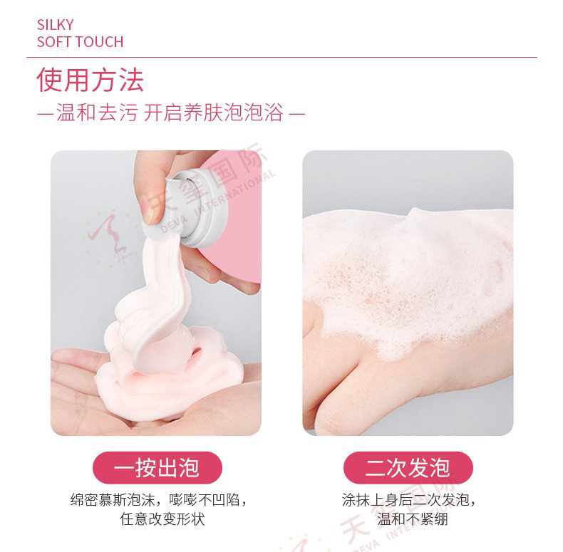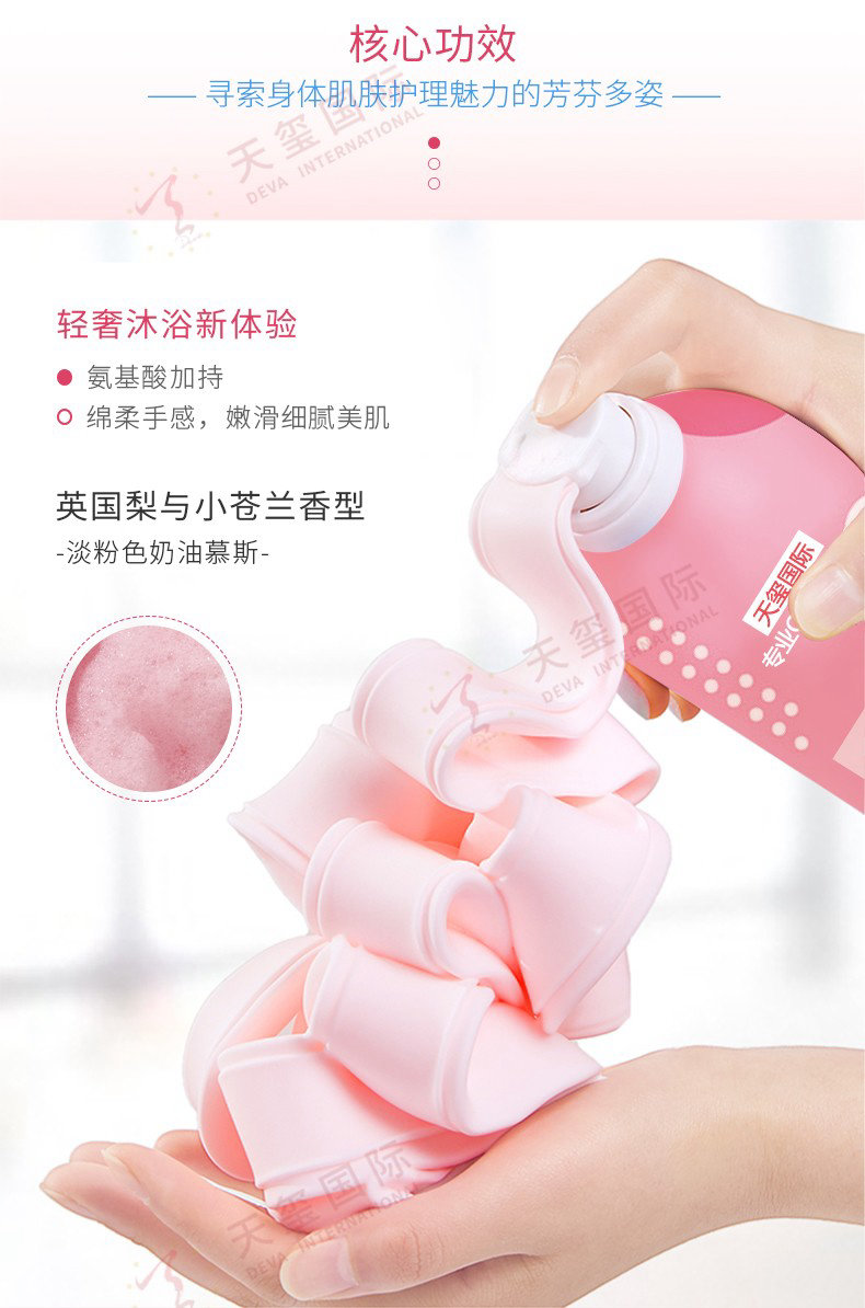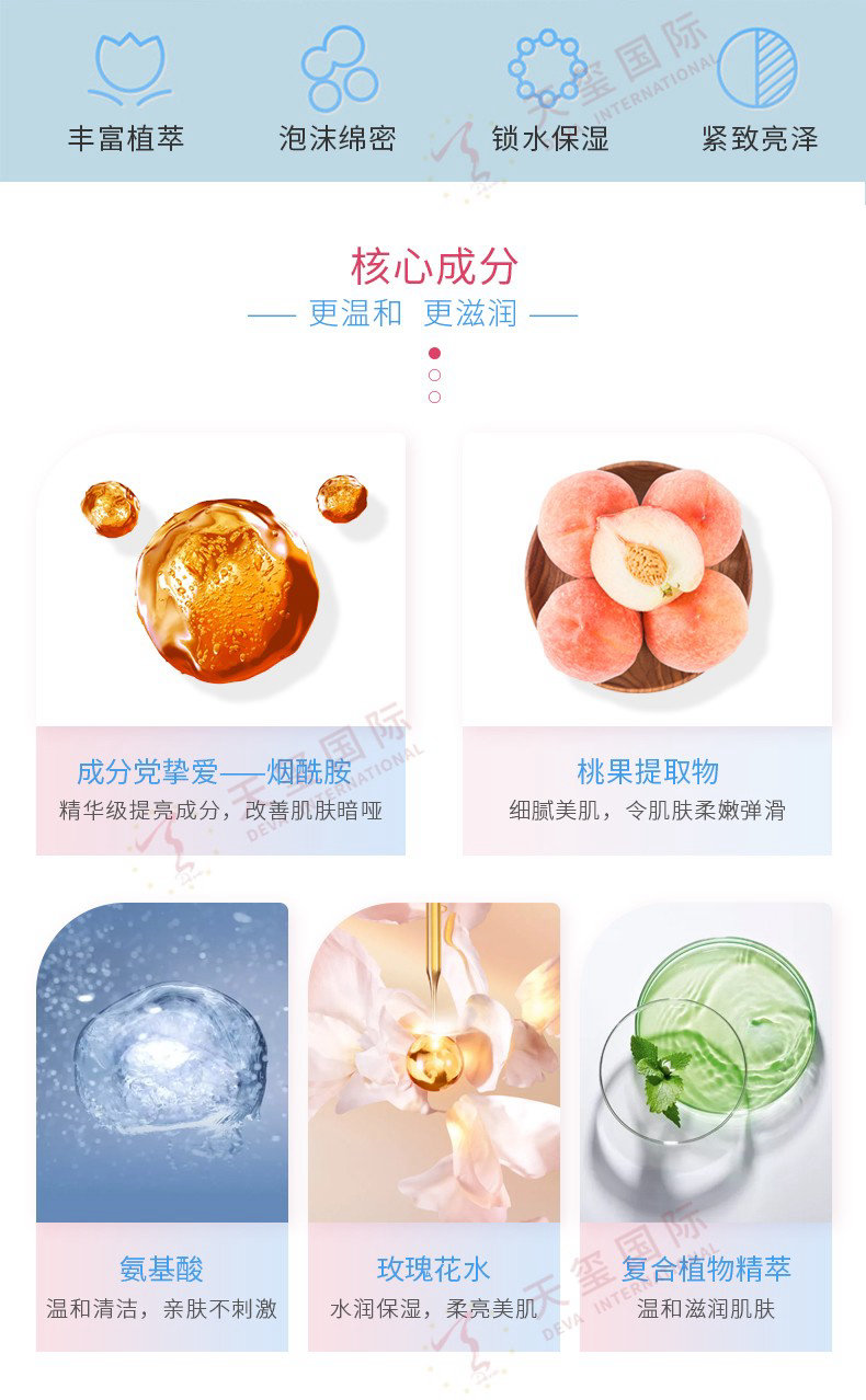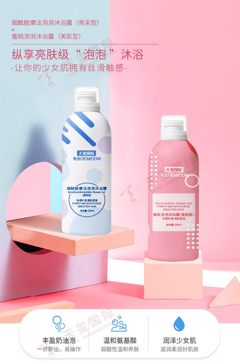 亮点/卖点:轻奢沐浴新体验,一按出泡,尊享沐浴中的护肤体验;烟酰胺沐浴露代加工:烟酰胺加持,柔软肤感,提亮光感美肌;蜜桃沐浴露代加工:氨基酸加持,棉柔手感,嫩滑细腻美肌