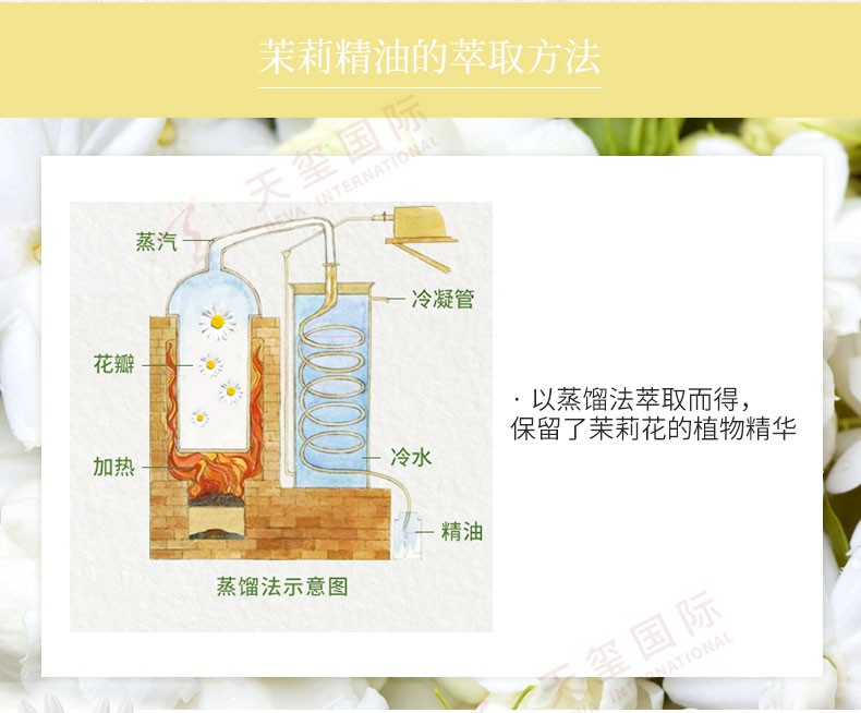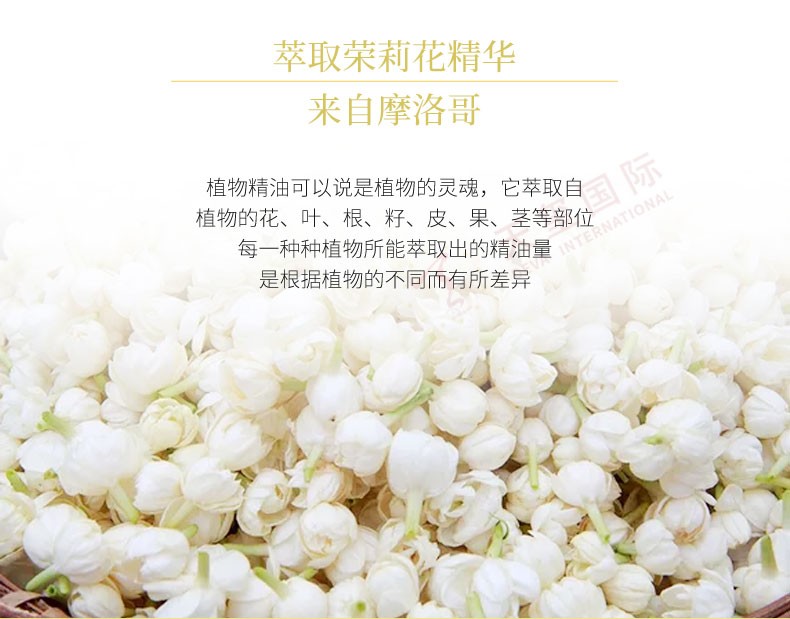 亮点/卖点:本茉莉精油代加工以蒸馏法萃取而得,保留了茉莉花的植物精华,茉莉花精油能收敛毛孔,舒缓修复肌肤