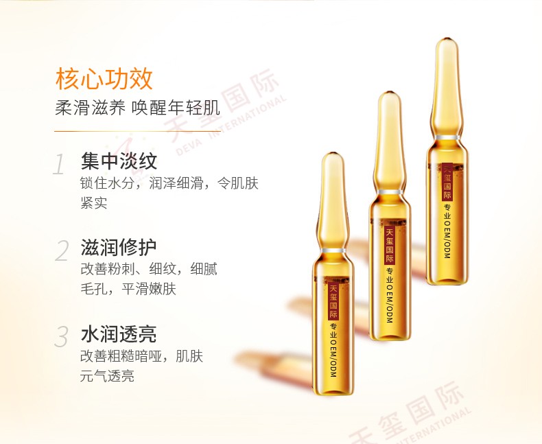 该产品为安瓶精华液代加工产品,并非现货可批发或单独购买!同时也有其他安瓶类产品代加工及全类型护肤品OEM/ODM,产品品类及功效众多无法一一展示,如需了解更多护肤品代加工可直接联系我司客服人员,感谢您的信赖与选择!