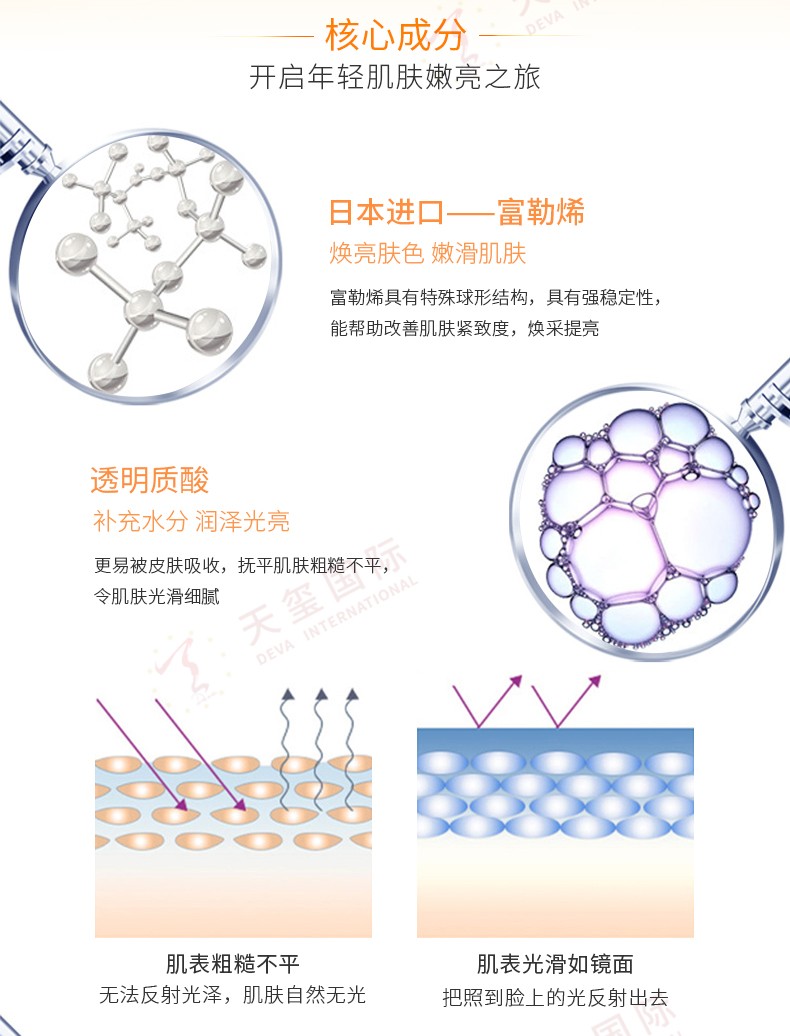 亮点/卖点:本安瓶精华液代加工加入6%浓度的富勒烯,焕活肌肤能量,柔滑弹嫩,有效对抗肤色不均匀、熬夜暗黄、肌肤暗哑、干燥缺水四类肌肤问题