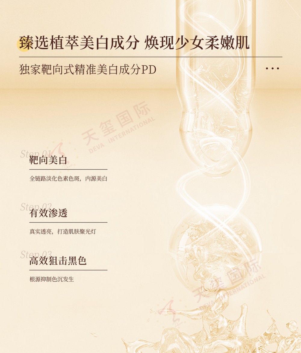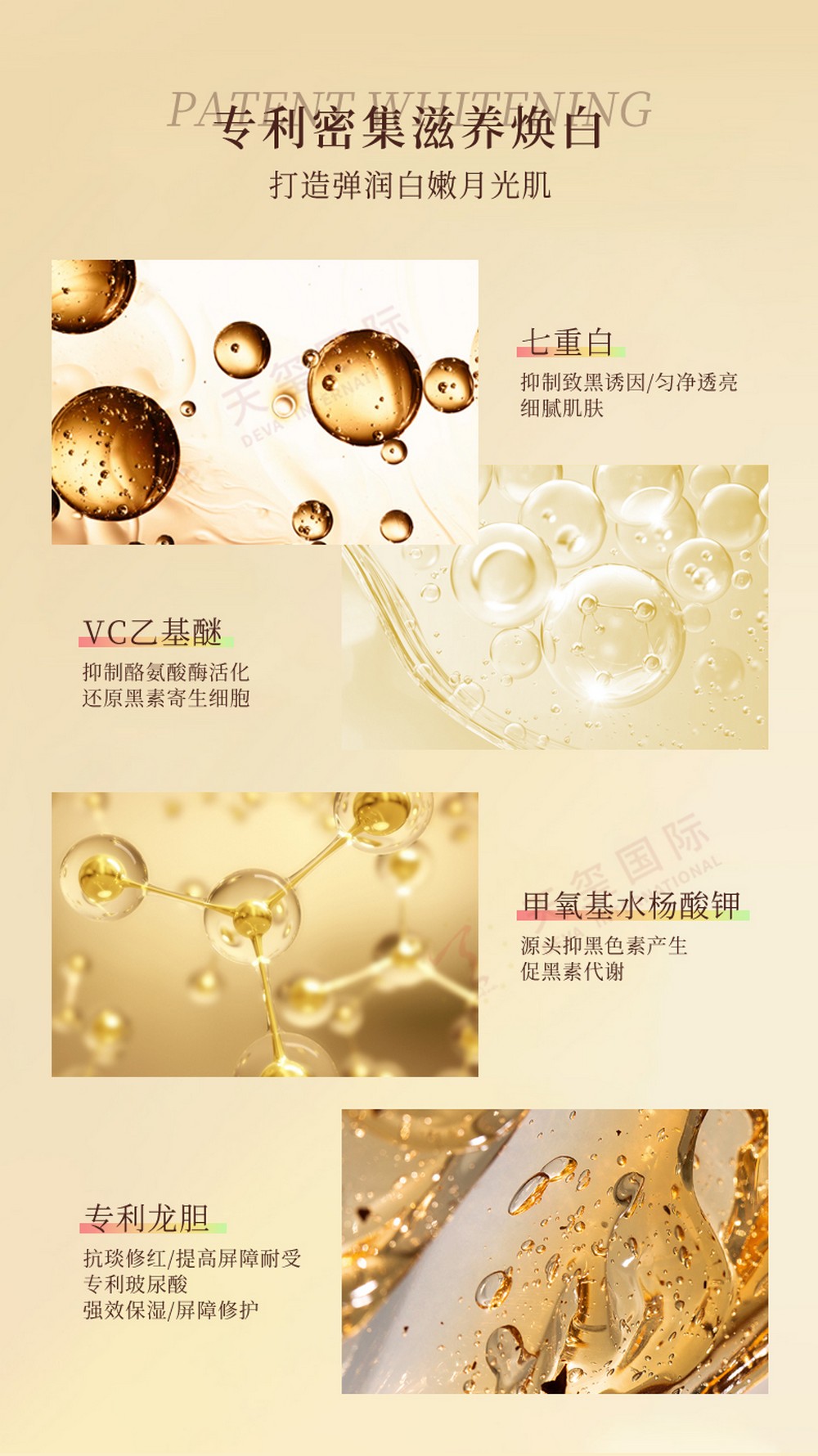 核心成分:独家靶向式精准美白成分PD,七重白,VC乙基醚,甲氧基水杨酸钾,专利龙胆