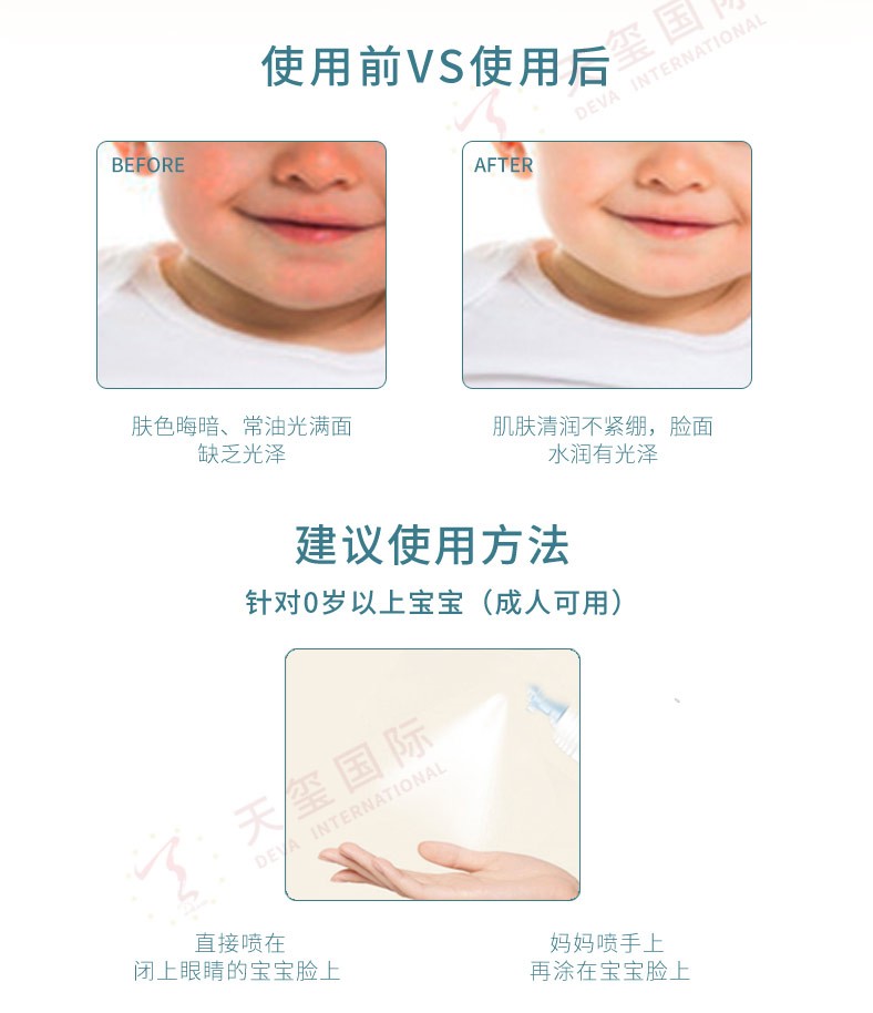 亮点/卖点:本婴童保湿喷雾代加工采用纯天然植物成分,天然安全配方极简,功能细化,有效补水保湿,止痒舒缓,舒爽肌肤