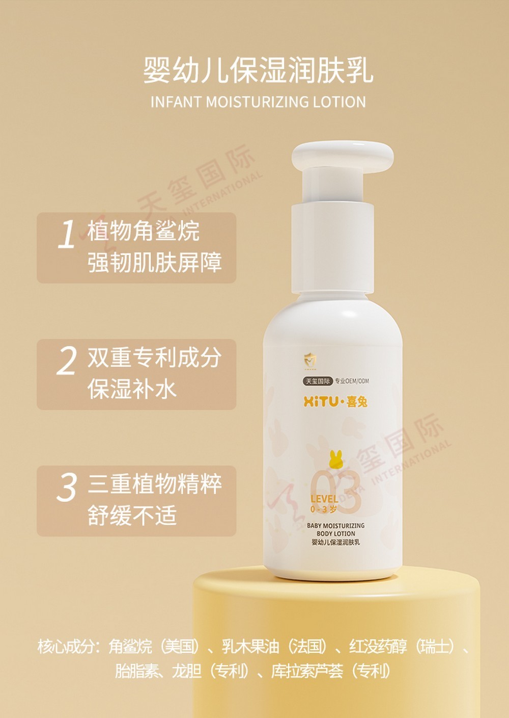 婴幼儿保湿润肤乳:植物角澄烷,强韧肌肤屏障;双重专利成分,保湿补水;三重植物精粹,舒缓不适