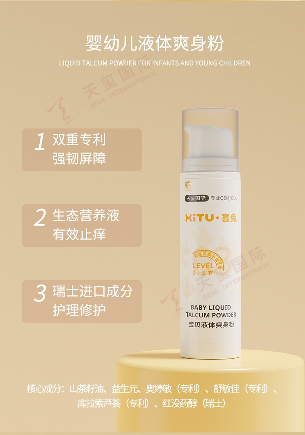 婴幼儿液体爽身粉:双重专利,强韧屏障;生态营养液,有效止痒;瑞士进口成分,护理修护